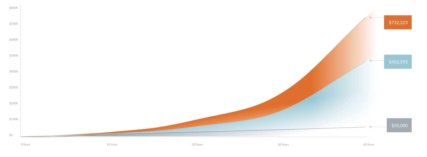 A $10,000 initial investment, plus a $50 deposit every month, with a 10% p.a. return every year, and the returns are reinvested, over a 40-year time horizon.