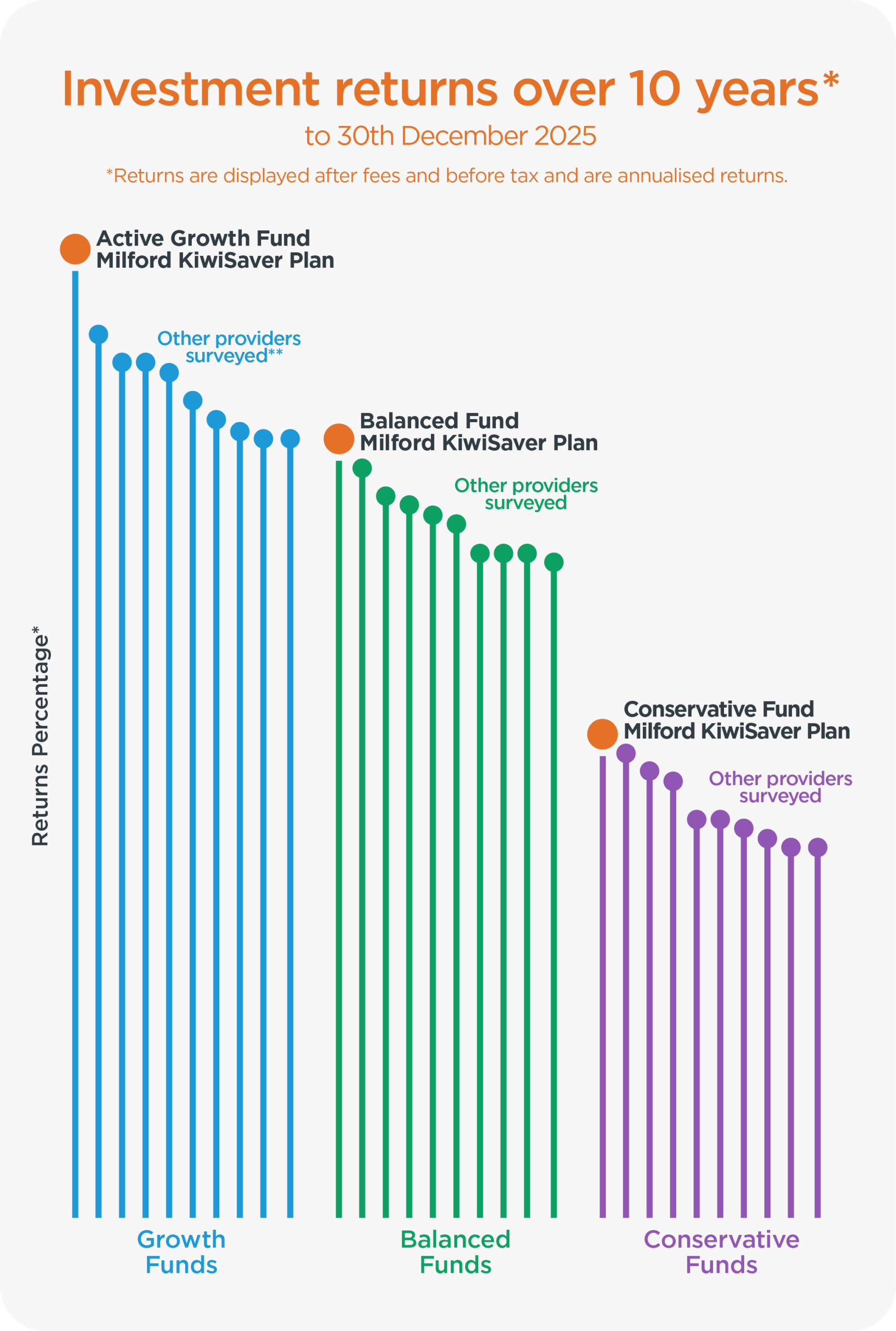 The graph shows three of our Funds outperforming other KiwiSaver providers in the Morningstar Survey over the last decade. To see how our performance compares to others in the latest Morningstar Quarterly KiwiSaver Survey here.